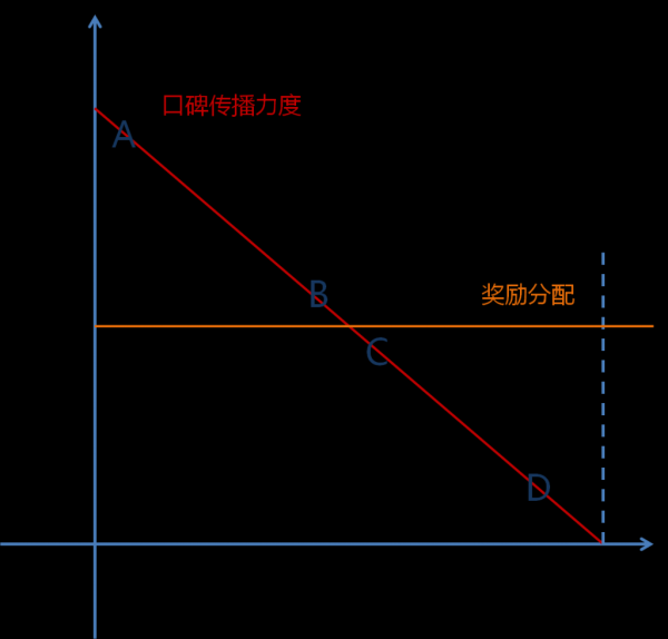 随便画了个图方便大家理解用户效益,红色是传播力度,黄色是奖励分配,A到D效用是在下降的。那我们来看下其实上面4种类型的用户对于活动口碑 传播度来说是有区别的,A类种子用户实际上对产品忠诚度非常高触发同时传播口碑,可以看作是投入产出大于1:1的用户,需要激发分享的成本很低,而BC两 类是属于中等水平 也就是那种投入1:1的用户,如果平均分配奖励资源那么可以看出有很大部分是被浪费的,但这个也是我们经常容易走进去的的胡同,就是一定要公平的发奖公平 的分配的福利,是如果反过来A类种子用户由于传播度和忠诚度都非常高奖励倾向于A类用户呢?效果肯定不一样。